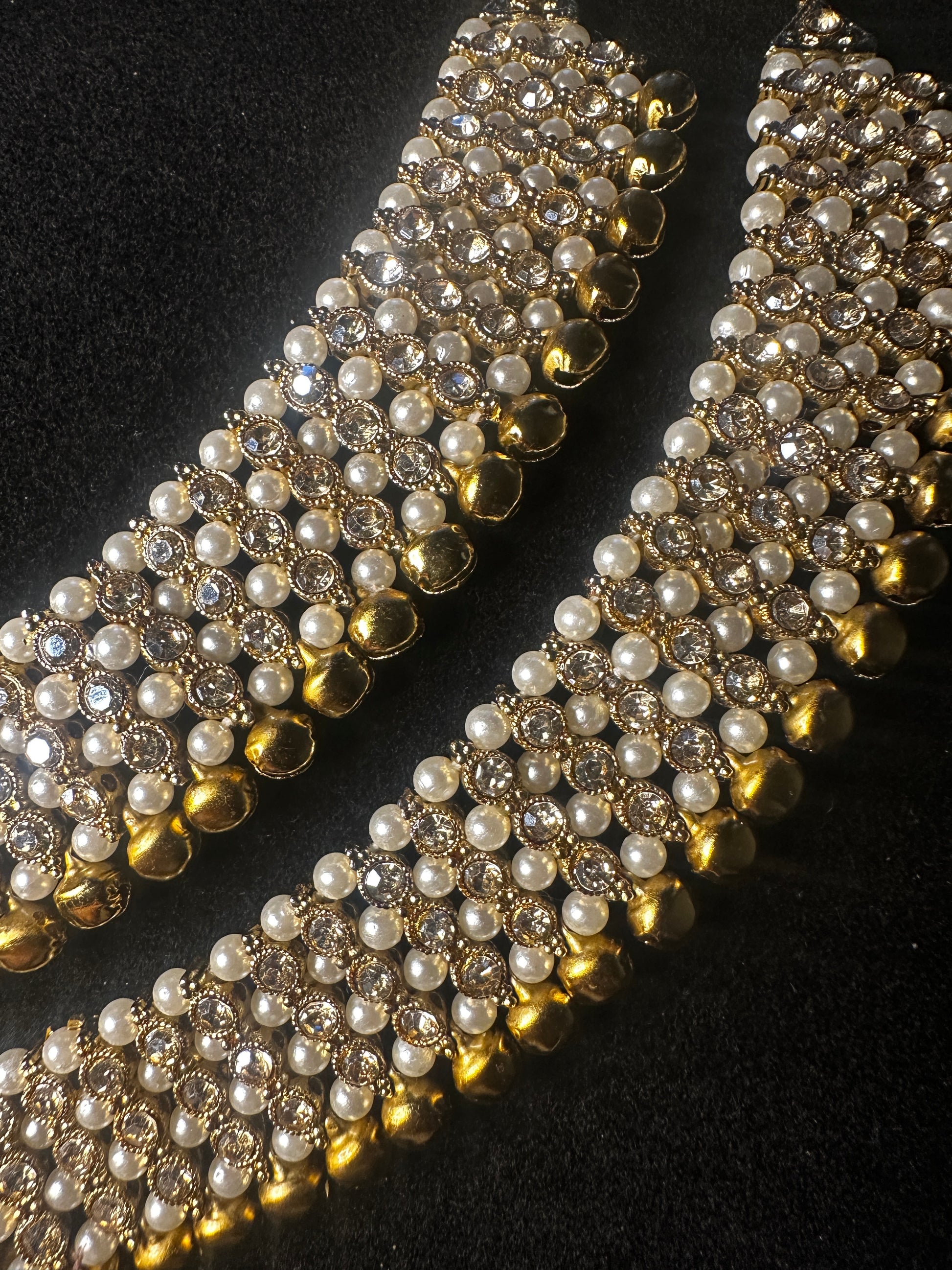 The Bridal Gold Jhanjhar is a stunning pair of traditional Punjabi anklets designed specifically for brides. These exquisite pieces feature intricate gold-tone craftsmanship with the signature melodic jhanjhar bells that create a beautiful, gentle sound with every step - a cherished tradition in Punjabi weddings.